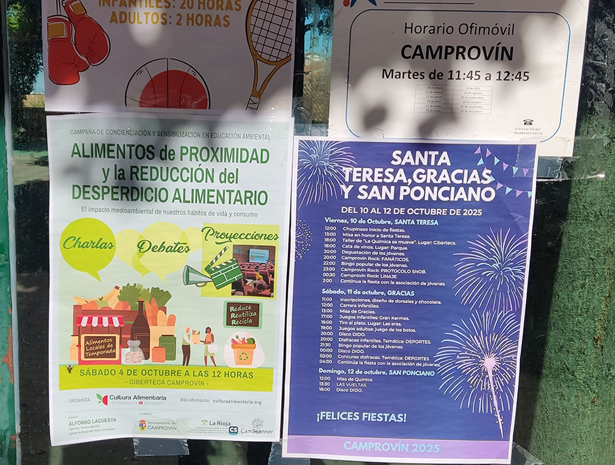 El sábado 4 de octubre de 2025 a las 12 horas en la ciberteca del Ayuntamiento de Camprovín tuvo lugar la charla sobre «Alimentos de proximidad y la reducción del desperdicio alimentario. El impacto medioambiental de nuestros hábitos de vida y consumo» en el marco de la Campaña de Concienciación y Sensibilización en Educación Ambiental.